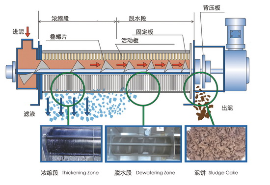 污泥在濃縮部經(jīng)過(guò)重力濃縮后,被運(yùn)輸?shù)矫撍?,在前進(jìn)的過(guò)程中隨著濾縫及螺距的逐漸變小,以及背壓板的阻擋作用下,產(chǎn)生內(nèi)壓,容積不斷縮小,達(dá)到充分脫水的目的。