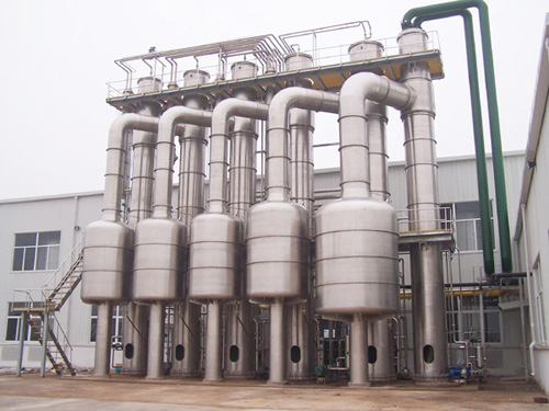 各效蒸發(fā)器、各效分離器、冷凝器、熱壓泵、真空及排水系統(tǒng)、各效料液輸送泵、操作平臺、電器儀表控制柜及閥門、管路等系統(tǒng)組成。